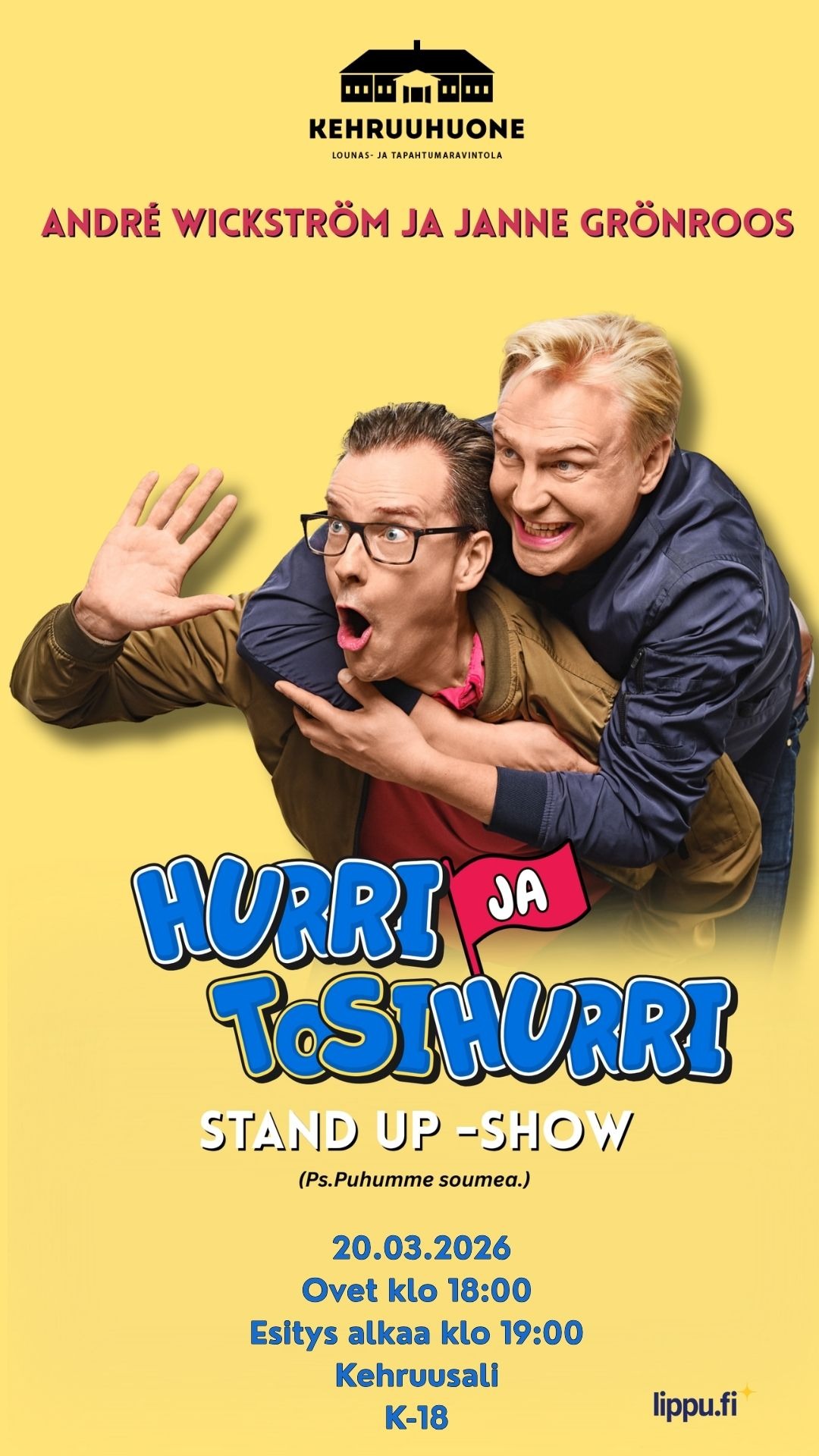 Tervetuloa nauramaan Kehruuhuoneelle 20.3.2026 Andrea Wickströmin ja Janne Grönroosin kanssa klo 19, ovet meille avataan klo 18. Meillä on myynnissä myös tapaslautanen hintaan 15€, jonka voit tilata halutessasi ennakkoon Kehruuhuoneelta esim. väliajalle tai ennen esitystä Kehruuhuoneelta puh. 045 614 8677 tai sales.lappee@sok.fi, p. 010 762 1000 ma-pe klo 9-15.30.