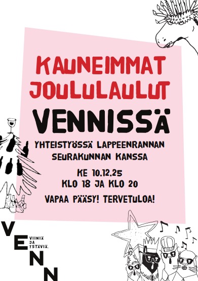Kauneimmat joululaulut VENNissä 10.12.2025 yhteistyössä Lappeenrannan seurakunnan kanssa.